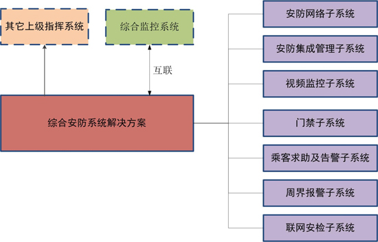 轨道交通综合安防系统由安防网络子系统、安防集成管理子系统、视频监控子系统、门禁子系统、车站乘客求助及告警子系统、周界报警子系统、联网安检子系统等构成。